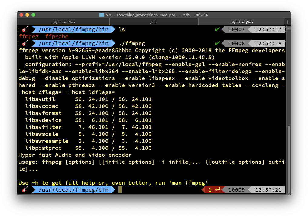 cd ffmpeg./configure --prefix=/usr/local/ffmpeg --enable-gpl --enable-nonfree --enable-libfdk-aac --enable-libx264 --enable-libx265 --enable-filter=delogo --enable-debug --disable-optimizations --enable-libspeex --enable-videotoolbox --enable-shared --enable-pthreads --enable-version3 --enable-hardcoded-tables --cc=clang --host-cflags= --host-ldflags=tar -zxvf yasm-1.3.0.tar.gz